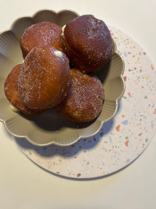 Den Pudding umrühren und gewünschte Menge Pumpkin Spice Sirup unterheben, in einen Spritzbeutel mit großer Sterntülle füllen und die Krapfen damit füllen. Die klassische Tülle zum Befüllen von Krapfen eignet sich aufgrund der dickflüssigen Konsistenz des Puddings hier nicht. (Ich habe vorher mit dem Griff eines Teelöffels seitlich ein Loch in die Krapfen gestochen, mit Kreisbewegungen etwas Platz für die Füllung gemacht und dann den Pudding hineingepresst).